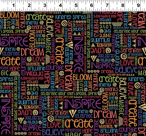 Celestial Magic fabric features uplifting words printed on a black background, bringing positive energy to your quilting projects. This unique fabric combines inspiring messages with a celestial theme, encouraging creativity and joy in every stitch. Ideal for quilts that warm the heart and brighten any space with thoughtful, supportive designs.